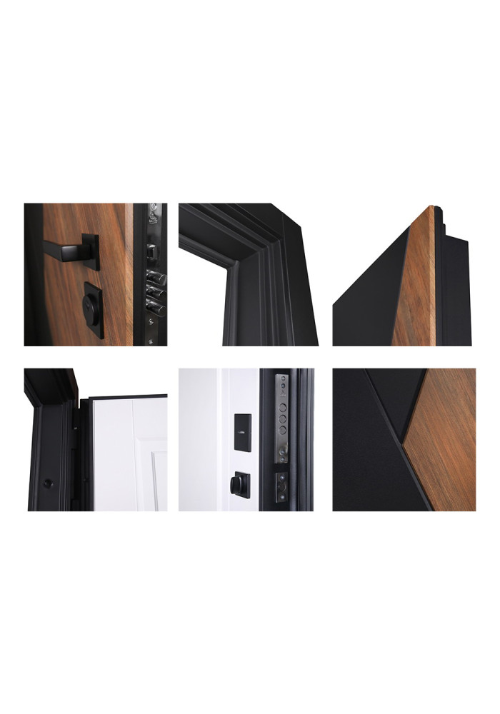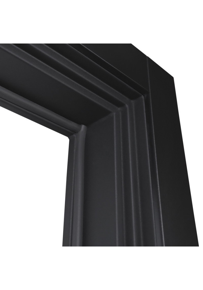 - Наружный лист металла: Лист металла 1,5 мм. Экошпонированная дизайнерская панель МДФ 10 мм (цветовая комбинация: "шагрень черная" и "дуб старый"). Наличник МДФ гладкий 80 мм (цвет "шагрень черная").
